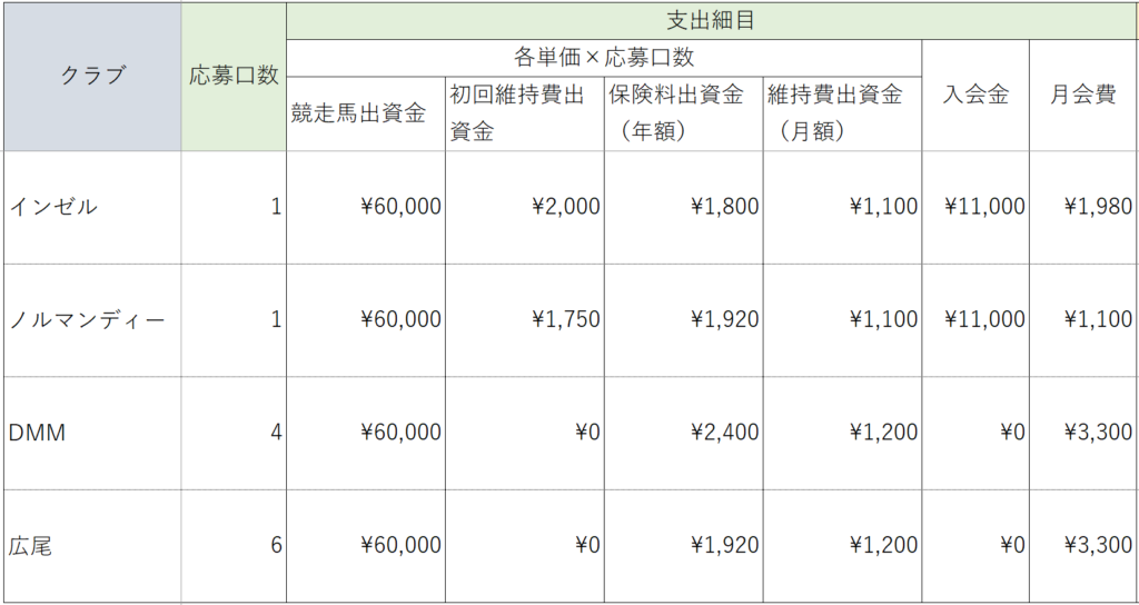 本当は1つのクラブに絞って運用できればコスト的にはいいのですが、そのクラブに良い馬がいることが前提ですし、希望する口数に当選できることが必要ですし、かなり現実的じゃないなって今回のインゼルの抽選を踏まえると思います。ある程度のクラブの分散投資は前提として、コストを最小化できるように工夫する必要がありますね🤔