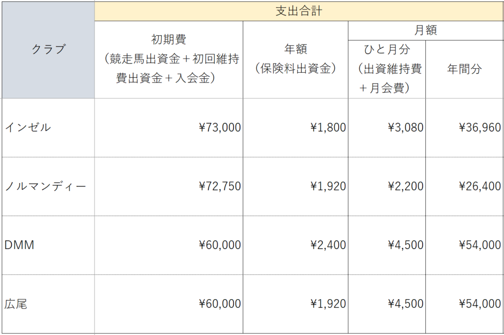 まず、毎月の支払とは別に、初回だけで維持費を徴収する「初回維持費出資金」の有無がクラブにより分かれます。この費用が掛かるから悪いというものではなく、維持費の頭金をいったん徴収しておいて、使わなければ引退時に精算されて戻ってきます。クラブによりますが1頭当たり100万円を募集口数で割って、出資する口数に応じて請求されます。