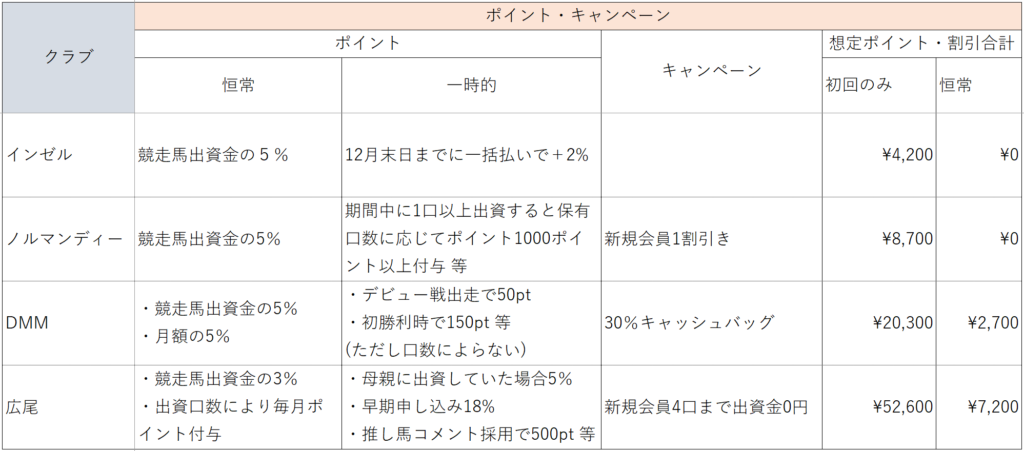 「じゃあ、1度きりの入会金を払ってでも月会費が安いクラブがお得なのかな」、と思うかもしれませんが、そんなに単純でもありません。さらに話をややこしくするのがポイント制度という各クラブの仕組みです。例えば、「早期に募集したら18%分のポイント還元」とか、「GIに買ったら2,500ポイント還元」とか、「新規入会で4口分の競走馬出資金を無料」とか、多種多様なポイント制度・キャンペーンがあり、競走馬の活躍も関係してくるため算出が困難でした😅